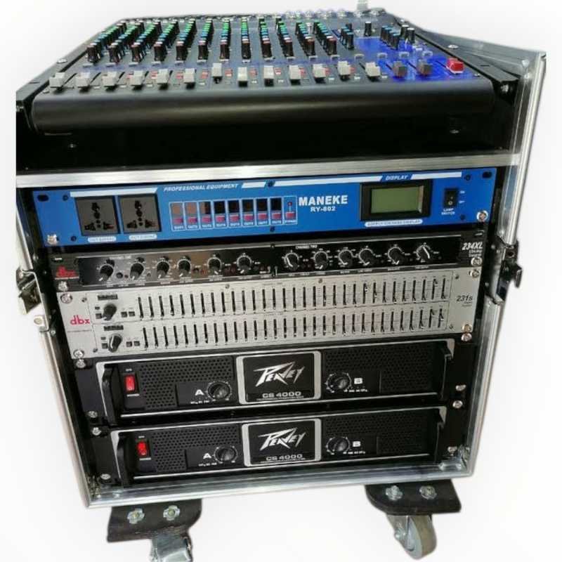 To handle the heavy lifting, the rack features two Peavey CS 4000 power amplifiers. These legendary workhorses are known for their durability and “anti-clipping” protection, delivering high-wattage performance that can drive large speaker arrays without distortion. The entire system is protected by a 10-port Power Sequencer, which manages the startup and shutdown of all units to prevent electrical surges and speaker “pops.”