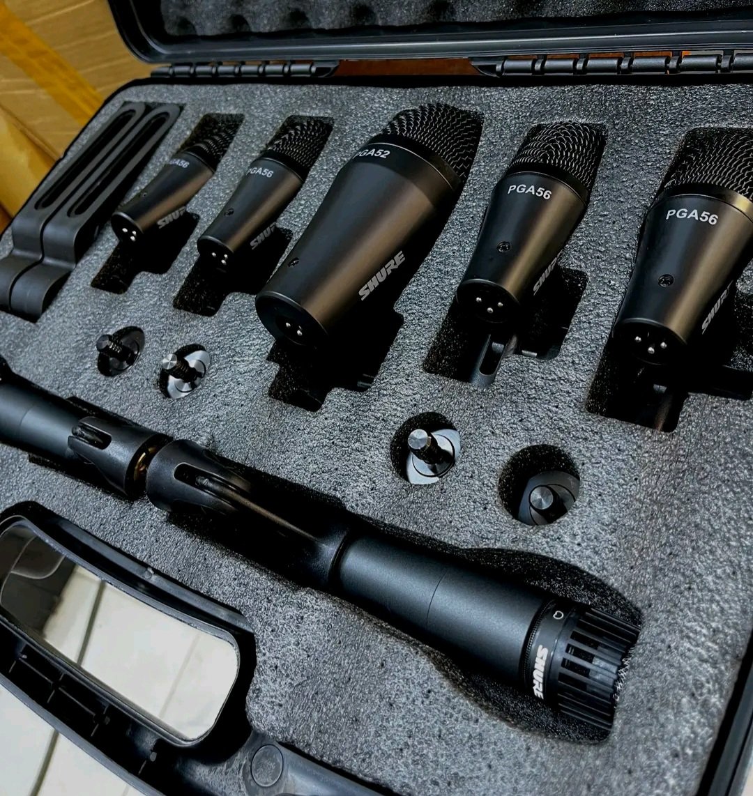 The kit features a specialized PGA52 dynamic microphone to capture the deep punch of kick drums, along with three PGA56 microphones featuring integrated swivel mounts for precise positioning on snares and toms. A versatile PGA57 instrument microphone is included for crisp snare or cabinet miking, while two PGA81 condenser microphones serve as ideal overheads to capture the shimmer of cymbals and the natural ambiance of the kit.