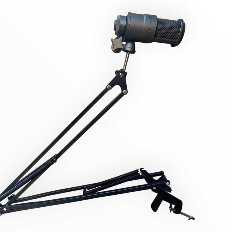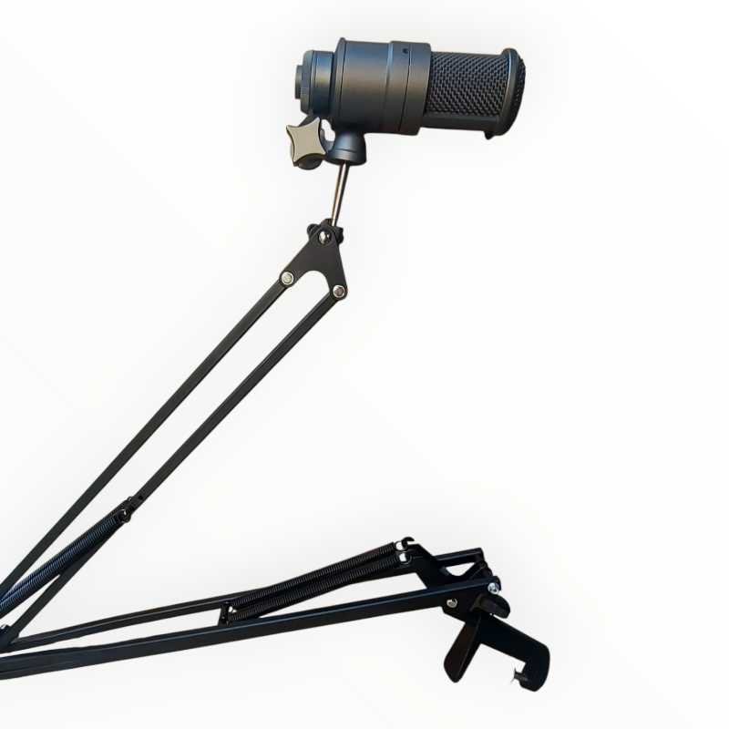 Adjustable Scissor Arm Stand: A heavy-duty, dual-spring suspension arm that attaches securely to any desk or table. It allows for 360-degree rotation and precise height adjustment, keeping the microphone stable while freeing up valuable desk space.